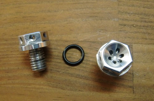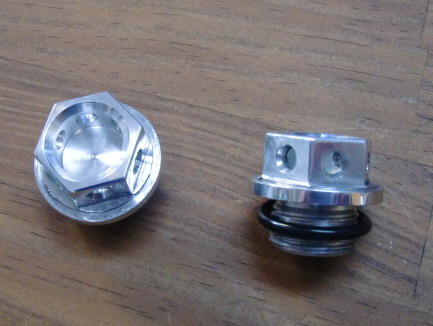 OILドレーンプラグ M20X1.5 アルミ削りだし ¥3800./一個 (税別) 味気ない鉄製のドレーンキャップを交換するだけで、とってもレーシーに! ワイヤリングの穴も開けてあります。 |