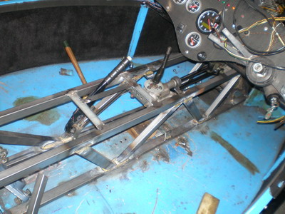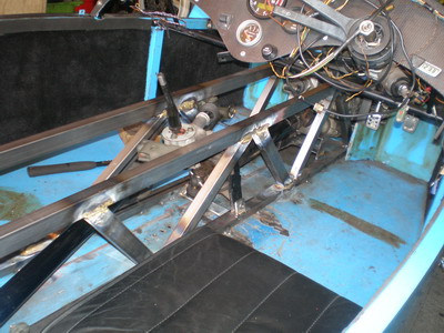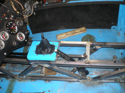 | 12/14 だんだん形になってきた、トンネル&コンソール。サイドブレーキも使い易い位置に変更です。レバー比も見直し、2ノッチ位で効くようにしました。サイドブレーキ横が浅い小物置き場、後ろが肘掛付(蓋ですな)のコンソールBOXとなります。 |