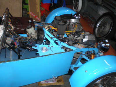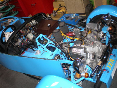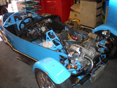 09y1/12 無事エンジンを搭載、セルも異常なく回るしで、いよいよ詰めの作業です。 先ずはマフラーを装着してエンジン始動、静かー!バランスも最高・・やはりマフラーの威力は大きい(当たり前) これから細かな所を仕上げていきますが、Kさん家に道具(ブレーキパイプのフレア製作ツール=何でも持ってますねー)借りに行かなきゃ事は、進まないー。 |