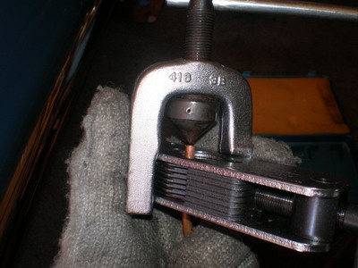| 3.2mm程突き出し、円錐形の駒で広げていく訳ですね。 | ピンボケですが・・・完成です。注意点はフレアナットを入れてから加工ですね。 |