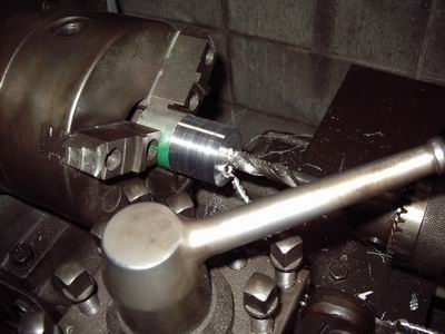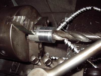 | 早速17Sの50mmアルミ丸棒を用意してホルダー製作にかかりました。先ずはセンターを出してから15mm程のキリで下穴を開けます。 | 刃(30mm)を取り替えてグリグリと開け、中ぐりで仕上げ(内径35.2mm)突切って完了です。 |