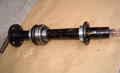| バランスマスター→ベアリング→バランスマスターと組み付けました。当初バックギアユニット前に1つ、後ろ側ペラシャに1つと思っていましたが、後側はスペース的に苦しく、前に2つ付けてしまいました。 | 組み付け完成の絵ですが、何かスッキリしていませんねー。ユニバーサルもでか過ぎるし、ゴテゴテの感じがイマイチですね。装着後試走した所、今まで出ていた120Km近辺の嫌な(唸る様な共鳴感)振動は消え、130以上でも今の所出る気配は有りません。一応効果はあるようです。バックギアユニットを手で触ってみても今までの振動よりは遥かに少なく感じられます。でも無ければもっとスムーズになるんでしょうね。 |