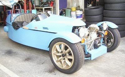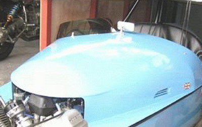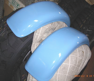 ケーターハム用サイクルフェンダーを縦割りにして40mm程詰めパテを入れた状態です。何しろタイヤサイズが大分狭くなるので、こうするしかなかったのですね。 |