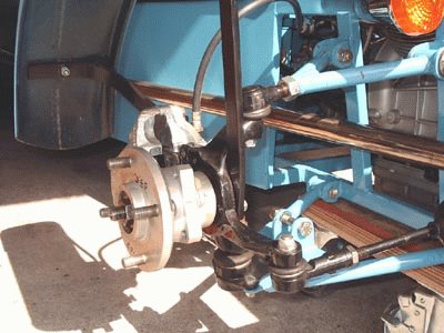 | フロント足回りをばらした所です。アップライトはスチールのMGかトライアンフスピットあたりの物ではないかと思います。ハブはPCD:108/4穴でフォードの小型車の流用でハブボルトを日産系12X1.25に交換しておきました。キャリパーは鋳物(鉄)製対向2ピストンの非常に重い物で、オーバークォリティーぽいです。この辺も要変更箇所の一つで、下に候補の一つを探し出しました。本当はロッキード辺りが最高なのですが、値段が・・・・。又、足回り取り付け近辺が弱そうなので、補強のパイプを追加し、ボディー剛性UPの手段(オープンカー)で簡単なアンダーフロアーにカーボン板を張ろうと思っています。カーボン板はウエットですが1000X2000のサイズ(ドア内張りによく使用)があるそうで、ダッシュもこれで製作します。 | ![]() |