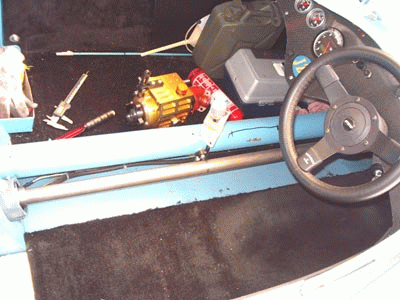 一番の原因はミッションとぺラシャの間にあるユニバーサルジョイントでダブルのタイプの為首を振ってしまい、そこに持ってきてセンターが出ていないぺラシャで振れが増幅されるのですから、きれいに回るわけがありません!偏芯された物が後ろに来て(高回転)増幅されるのですから、曲がらない物も曲がりますね。 何か全てがこの調子で半端な作り込みですねー。 向こうの人はスピードもそんなに出さないんですね。(出そうと思っても100K以上出せませんが=車体が分解するんではないかと言うほどの振動が出る)) マーキングの部分はバックギアユニットが入るスペースで薄いパイプなので簡単に凹みそうです。(現在は既に凹ませてあります) 強度はユニットを強度部材にして落とさないようにします。 センターが出ない為と、余り右に寄せると運転手が乗れなくなる為の苦肉に策です? 又、クラッチとのクリアランスが見ての通りですから、余り大きなジョイント等も使えず、ベアリング等も側まで持っていけません。お陰で首を振り振動が出たんですね。(シングルタイプを使えばいい物を!) |