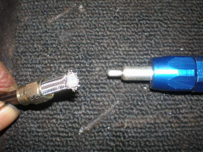 | 特殊工具ってほどでもないけど・・・これは優れ物のツール!切り口のメッシュを広げ、テフロンホースの内側&切り口を一発で整えます。 | 広げたメッシュとホースの間にオリーブを打ち込み、ほぼ完了です。後はフィッティング(バンジョウその他)を差込、ネジ部に専用OILを塗り、締めこんで完成となります。 |