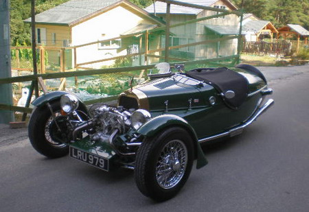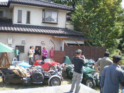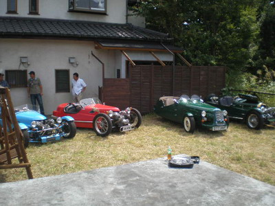 | 本場イギリスの集まりにも匹敵?するような眺めではあります。日本にある3輪車の全種?が一同にって感じ!?(笑) 雰囲気も日本でないみたい・・・K氏宅ガレージ上のバック・ヤード。 |