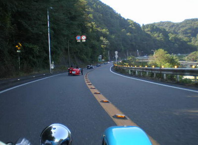 | 始めて見たJZR後ろからの走り・・・うーん安定してるし速い!!ついていけない!あれで4000回転(後で聞いた)かー・・高回転まで回すと速い訳だ。(笑) 時々、走りやさんがついてきて信号等で横に並ぶや「速いですねー」なんて言ってますが・・実感! |