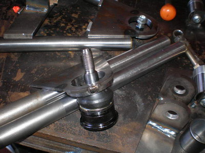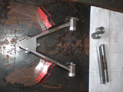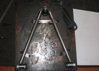 ビィートル用BJ。新たに削り出したリングが右写真のように、上になります。 ジグにSETして溶接を待つのみとなった”ロアアーム”。