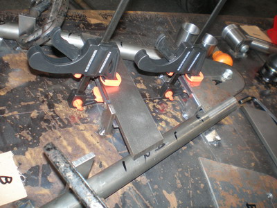 5mmの板材とアルミ丸棒で削り出したカラーで品物を押さえ、鉄板上に引かれた線に合わせて仮止めします。