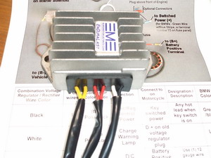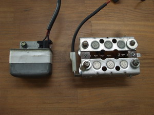| 右の機能を集約させた「レクチェファイヤー・レギュレター」最近のBIKEは殆どがこのタイプで、滅多に壊れる事も無くとても安定した電流・圧を供給してくれます。上記KITのパーツとなりますが、単体でも購入可能です。 ¥17500.(内税) BMW&GUZZI | 上記右は、上の発電機とSETの悪評高いダイオード・ボード(整流器=交流から直流に変換)、左はレギュレター,通常は13〜14Vに安定させるパーツです。BMW&GUZZI |