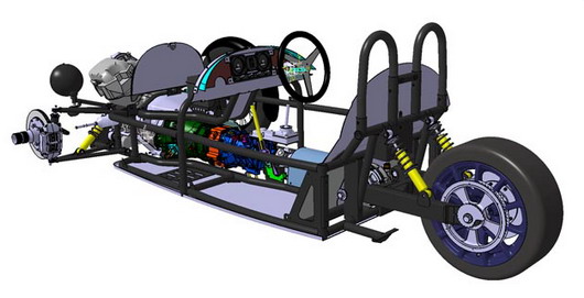 透視図というか、外装を剥いだ絵ですが、駆動系やM/Tの様子がそこそこ解りますね。 ペラシャからチェーン駆動の変換は思った通りの構造でした。 しかし、当たり前ですが良く出来てます。 フレームはそんなに高強度ではなさそうですが、3輪(後ろが1輪)ですからこんな物でOKなんでしょう。 |
