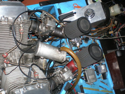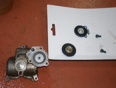 | フロート室を外し、加速ポンプをバラシ、パーツ交換です。ダイアフラムは大分痛んでいました・・・これは正解です。 | 組み立て完了してエンジン始動、オーバーフローは完治してました。やはり加速ポンプ部でした。加速ポンプが調子良すぎて(2m位は水鉄砲のように飛びます=調整式にしようか?)パカパカ踏むと良くないですね・・”じわーっ”と踏むのが正解。 |