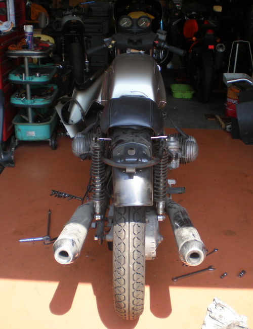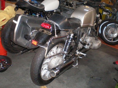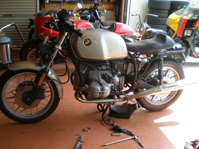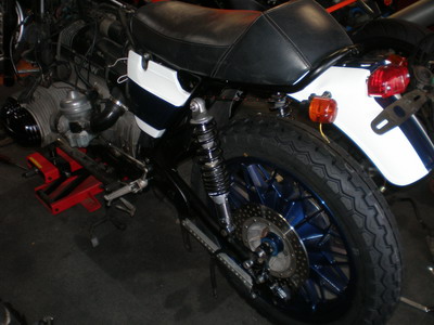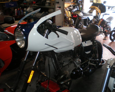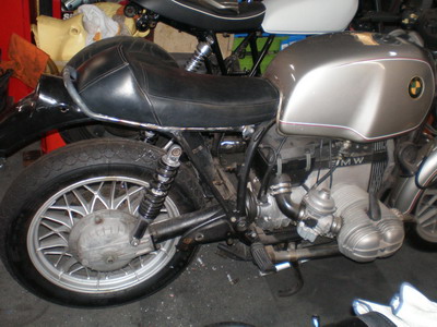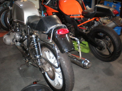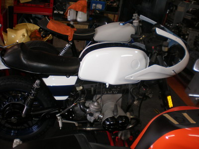 | 手持ちのR100RS/ツインショックをレストアでもしようか?なんて思いバラシ出しましたが、外装の状態が酷い!もったいない気もしましたが、これを題材に軽快なクラブマンレーサー的な車両でも・・で始めてしまいました。タンクはノーマルを使いシートを小ぶりのセミシングル、シートレールは作り直してショック(コニに交換)を少しレイダウン、マフラーは少し短めのノートンタイプ、フロント回りは国産物を使い少し確り感を出そうと思っています。タンクのペイントも状態が良くないので、リペイントですが・・・パールホワイト+ブルーラインかなー? |