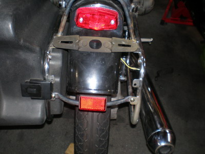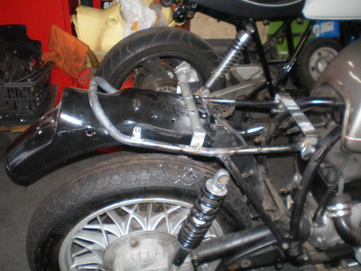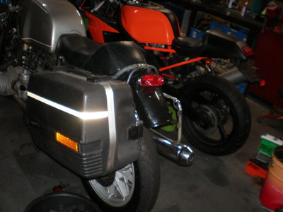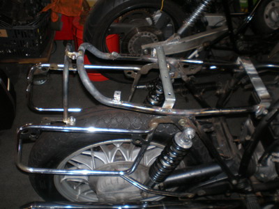 | フェンダー(SR用?)をSETしてみる・・・良い感じですね。 | パニアもぶら下げるが、左右に少し弱い!下のように左右を連結。 |