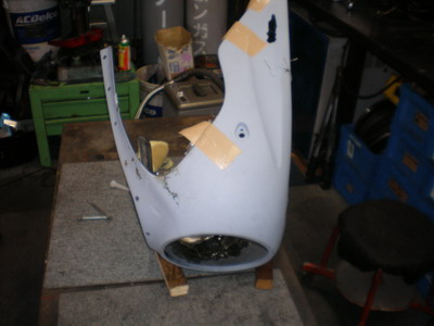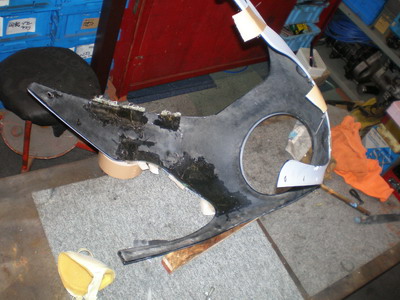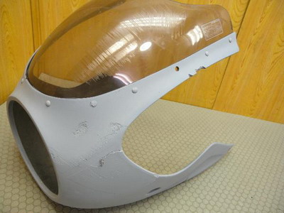 | ロケットカウル(バンディット)が手に入ったのでこれを使います。レア物のカウルで新品は凄い値段!バキバキに割れている物でもそんなに安くなかった・・・ファイバーなので修理は楽ですね。 | デカールの上からサフェを吹いてあるんですから!結局全て剥離になってしまいました。面倒!! |