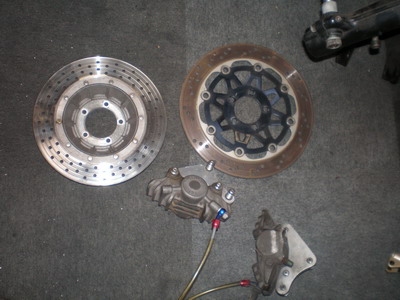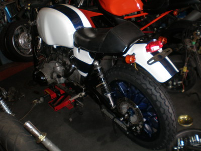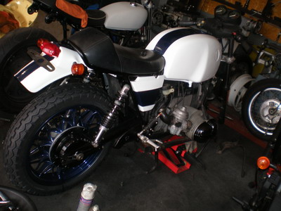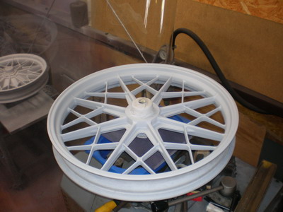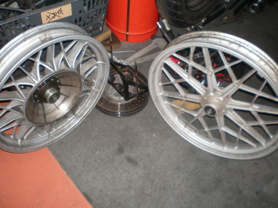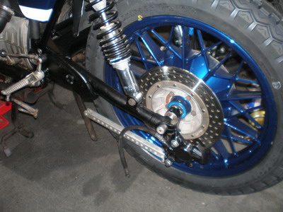 | サイドガバー&Rフェンダー&ホイールの塗装が終り、組み付けです。ホイール&ストライプはブルーメタ(ステップWの純正色=全色大量にある為)、基本のホワイトはアコード・・・・何故かHONDA・・・・たまたま在庫のウレタンが在ったのでした。 | 光が当たると結構”派手派手!になるブルメタですね。 ローターはBM純正を旋盤加工して少し小径に!・・・ヤマハ系Rブレーキを使用する為です。BM純製三角ブレンボは重い(サポートを含め)しデザインが・・・。そこで手持ちのキャリパーを当ててみれば案の定、少しの加工&カラー追加でバッチリ!マスター&ステップもヤマハ系で決まりです。 |