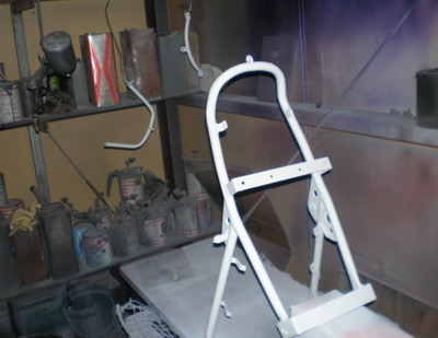 | ライトステーの切りはりです。こんな物でも位置決めやら板の切り出し溶接等が結構面倒な作業です。 | カウル&ライトステー(クロモリ)の塗装です。サフェを塗り、黒の艶消しです。 |