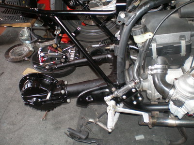 | デフケースを艶消し黒にペイント、ついでにスイングアームも汚かったので塗りました。現在、こんな情けないかっこうに! | タイヤ(ME77)も古いので交換。(10年以上前の物でした)ホイールもペイントですが・・・何色にするかなー?ほぼ、決めてはありますが。 |