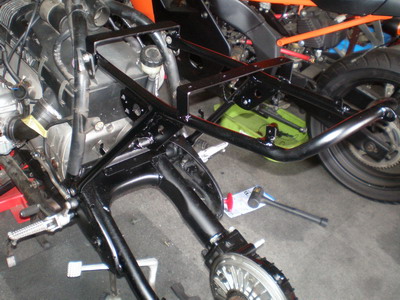 | サスはKONIのSR用を少しレイダウンして装着。 | 連結すると剛性がぐっとあがります。センターにリフレクターを取り付け=車検用。 |