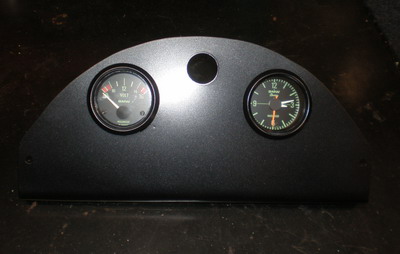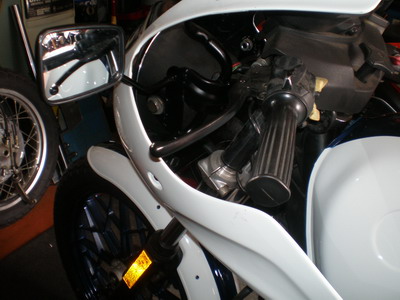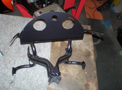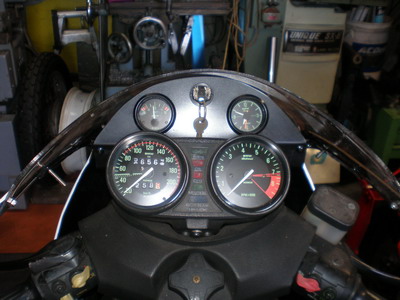 メーター(純正)&キーシリンダーをSETすべく、パネルの製作です。アルミ板を切り抜き、カウルステーにステーを介して装着・・・まーまーでしょ。 |