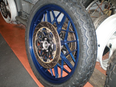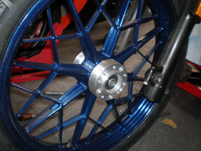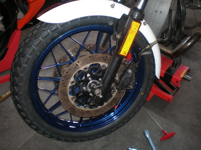 6月16日 早々ホイールにSET,ローターを付けてフォークに仮組です。コンマmm単位の作業ですが、微妙なクリアランスも一発でOK!慣れですね。フォークとローター&キャリパーとホイールのクリアランス、そしてホルダー&キャリパーとフォークの辻褄合わせ・・・一番加工の少ない取り合わせは、スチール/5mmの板材でホルダーを・・でした。結局フロントはノーマルキャリパーでいくことに・・・既にホルダーの製作は進み、17日にはフロントブレーキ関係は完成しそうです。 |