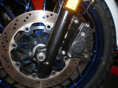 上のホルダーをペイントし、装着完了なったFキャリパーです。 |