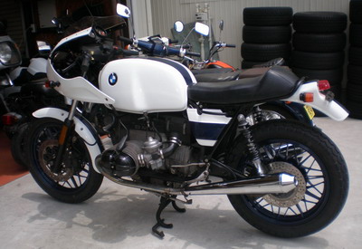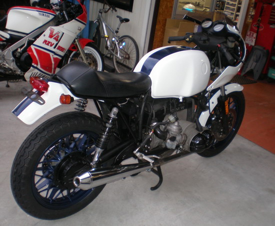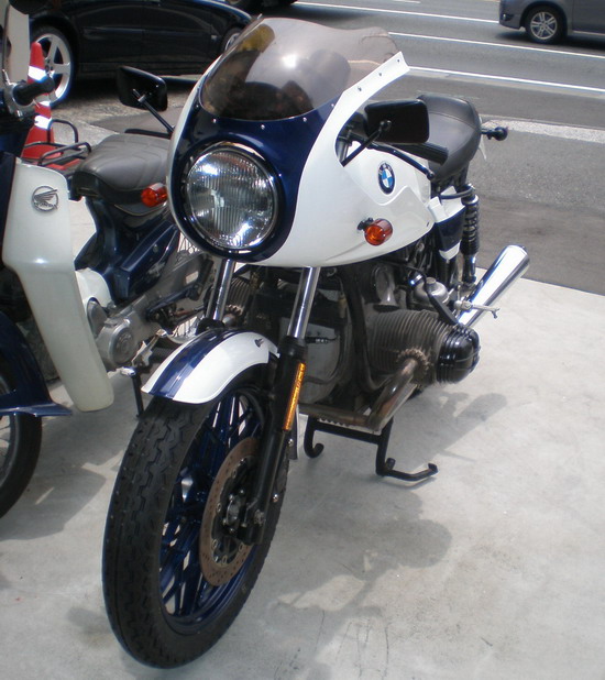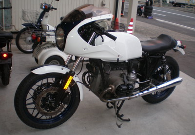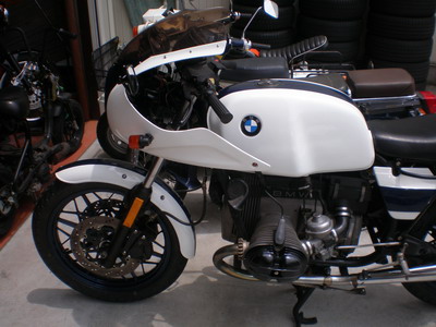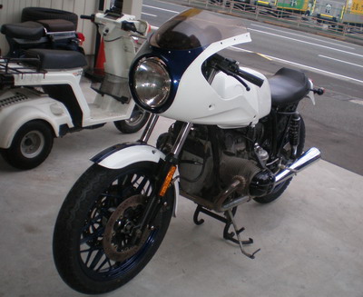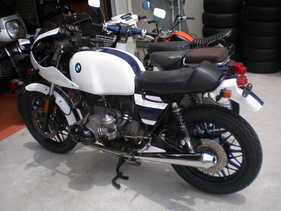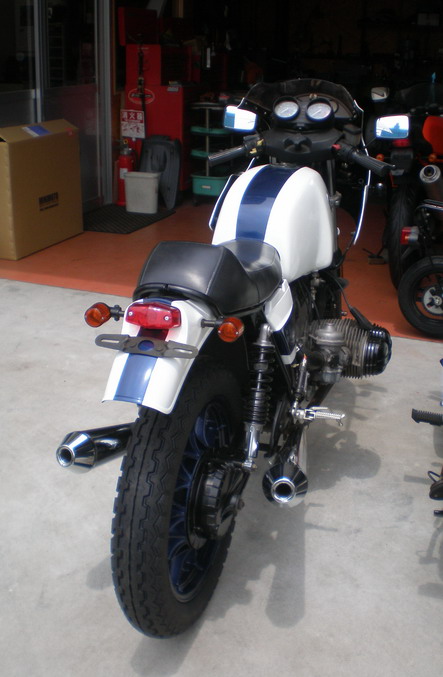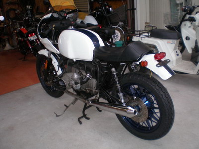 6月29日 天気がよいので表に引き出し撮影です。ほぼ完成した「R100RS改」。タンクマークを貼ると引き締まりますねー。 |
