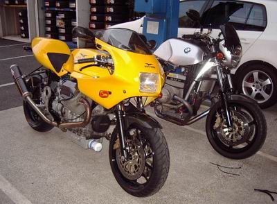| やっと出来上がったMySport、これでBMの出番が少し減ってきますね。 乗った感じは同じ空冷2気筒、2弁、シャフトでも全くの別物で面白い物で す。癖はやはりGuzziの方が強いですね。加速感等も別物で、Guzzi=怒 涛の加速、BM=シャープ(2気筒にしては)な感じです。 |