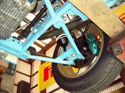 このフローティングデフが駆動がかかると外に逃げる為スラスト方向に首を振りカタカタするんですね。エンジンが2気筒の為にトルクの出かたがスムーズでなく低速の時に顕著に出ます。デフギアのバックラュシュかと思いきやそうではなく、ホイール駆動のスプラインとのバックラッシュ音でした。ホイールをサイズUPしている為にデフを外にオフセットしている為余計に出る(駆動がかかると外に逃げる)ようです。固定デフタイプには無い症状だと思います。ピロボールを使用して、デフ前側のスラスト方向に対する動きを無くそうか検討中です。