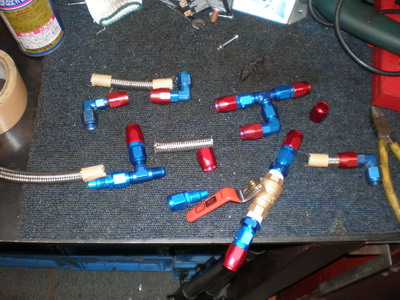 パーツも揃い、いよいよヒーターの配管です。後輩が持ってきた弁(バルブ3/8NPT)もアールズのフィッティングにバッチリでした。アールズ製は4〜5000円しますが、これは”ん百円”・・・で、ただ! アールズ(6#=スイベルその他)の方は・・・結構かかりました(個数は15もあります)。曲がりが高い! ホースも”お高い方”の(パフォームOフレックス)と言うやつで=曲げが楽。 なんだかんだ結構な出費ですが、これで少しでも暖かくなると思えば・・です。(笑) |