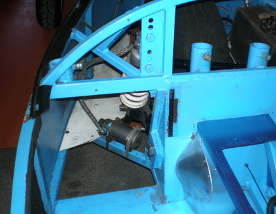 | さて、エンジンでも載せようかとクラッチ、M/T、セルやらその他をSETしてゆっくりと差し込んでみれば・・・あっちやーセルがぶつかるよー・・こりゃー入らないやー・・でフレーム加工です。 ドタバタしてる時にKさんが年始の挨拶に!で、丁度いいやで相談です。 「フレームカットで三角の板を溶接が早いでしょ」・・本人熱くなってるので、傍からの意見を聞くのが懸命。 これで行きましょ!・・・完成形が右の写真です。縦の強度はバッチリです。惜しいのはリブを立てれば更に良かったってことですが・・・まー十分でしょ。 |