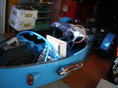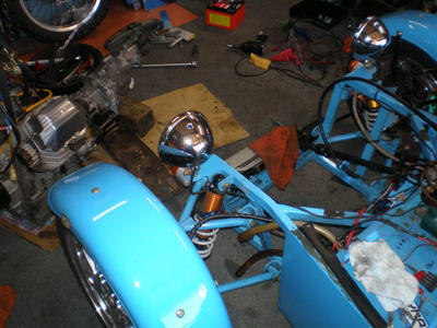 09y1/12 無事エンジンを搭載、セルも異常なく回るしで、いよいよ詰めの作業です。 先ずはマフラーを装着してエンジン始動、静かー!バランスも最高・・やはりマフラーの威力は大きい(当たり前) これから細かな所を仕上げていきますが、Kさん家に道具(ブレーキパイプのフレア製作ツール=何でも持ってますねー)借りに行かなきゃ事は、進まないー。 |