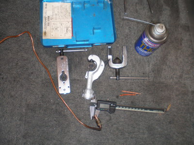 | マスターバック追加に伴い、ホースの加工が必要になります。ステンメッシュで引き直そうか迷いましたが、結構な出費になるのでノーマルの銅管加工になりました。上の特殊工具がKさんより今回お借りした「チュービングTooLセット」と言う銅管先端にフレアを作る工具です。 | これが優れ物のパイプを掴む工具ですが、フレキシブルに色々なサイズのパイプを掴む事が出来ます。 |