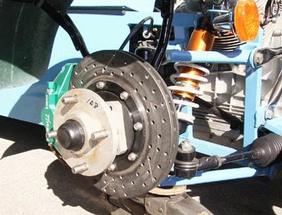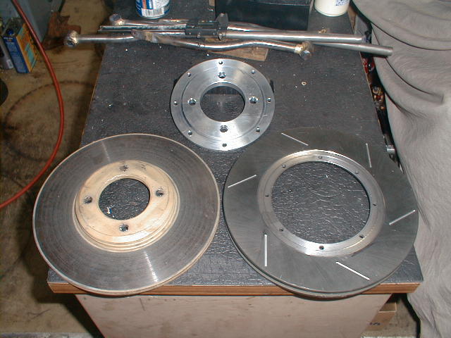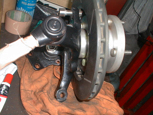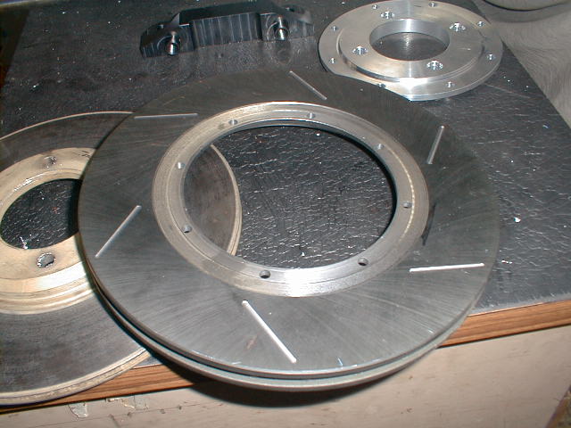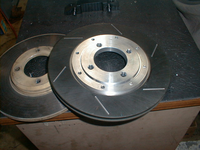 | ベルを被せた所です。2ピースのローターになる訳ですね。フローティングでは有りませんが問題は出ていません。ローターはドリリングして、上の写真の状態にしました。 | アップライトに組み付け、キャリパーホルダーの製作に進みます。 |