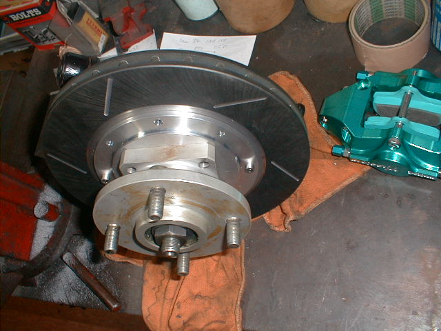 | ローター→ベル→ハブと組み付けた図です。右のグリーンのラジアルマウントキャリパー(プロジェクトミュー)/2ポットがこれに取り付きます。ハブボルト(PCD:108/4穴)はこの状態では使用せずボルトを抜き、PCD:100/4穴のM12/1.5ピッチ穴をあけ直し、国産ホイール使用に対処しました。 |