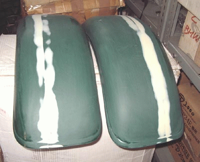 ケーターハム用サイクルフェンダーを縦割りにして40mm程詰めパテを入れた状態です。何しろタイヤサイズが大分狭くなるので、こうするしかなかったのですね。 |