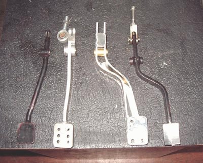 9/24に仮ナンを付け三浦半島一周を慣行!昔よく仲間とBIKEで走り回った三浦(剣崎)の西瓜畑のカントリーロード&金田港近辺のワイディングを走ってきたのですが最高でしたね、そこそこのスピードでもとてもエキサイティングですし、ゆっくり流せばツインの鼓動が感じられ頬がゆるみっぱなし・・・。箱根まで行かずともJZRには最高のシチェイションでとても楽しめましたし、近いし行き帰りの苦痛が最小限ですみます。カメラを忘れ紹介できないのが残念!(風力発電のペラをバックにJZRを写したかったなー) そして今回のショートツーリングでの問題点を解消する為にいよいよ弄りガ始まりました。まずペダル配置が悪く、クラッチが左により過ぎていて、踏み込むとプロペラシャフトに左足が当たり!!(ギリギリ追い込んである為)とても不快です。アクセルとブレーキの関係も悪く、外人のデカ足が狭いフロアの中で操作する為の妥協の産物ですね。これらを整え材質もアルミ(17S)材より削り出し、回転部(ピボット)にはメタルを入れガタを無くしました。左右にある鉄製のものがノーマルのペダルで何とも情けない物で”弄り”が始まりました。又、マスターを押すロッドはピロエンドとしてカチッとした足応えに近ずけました(BOXの強度&取り付け部強度が足りない為そこそこの踏み応え)。全体に剛性感も向上させたつもりです。 |