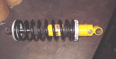 | ケーターハム用の足(アラゴスタ)を自由長を詰め(ストローク長はそのまま)装着しました。取り付け部は全く同じでした。ネジ式車高調なので、車高は自由に変えられます。スプリングはノーマル150−60−050でレートのみ暫定的に車重(エンジン重量)を考えて030(3k)としました。ショック自体は当たりが柔らかく減衰の立ち上がりが早い(無段階減衰調整付き)、とても良いショックです(クシュと入って、スッと止まる、という感じ=オーリンズ付きBIKEに似ている=分るかなー)。 | ![]() |