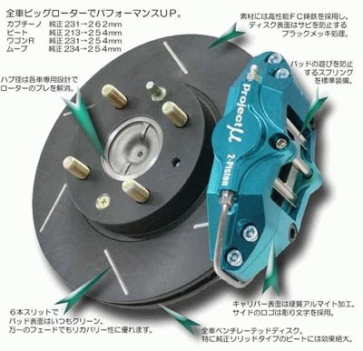 | これが軽カー用の2ピストン(対向)キャリパーKITで、定価¥138000で、とてもリーズナブルです。大きさも丁度よくベンチのローター径が10インチ(254mm)でバッチリ、キャリパーがラジアルマウントでホルダーも作りやすいし、言う事なしですね。ローターはセンター部(ベルハウジング)を7075のアルミで削り出し&アルマイト加工し車に合わせます。後はホルダーを削り出してOKですね。このKITは安いですよ、ローターX2,キャリパーX2、パットX2、ステンホースX2,ホルダーX2,その他小物類も全て入っての値段ですから。KITには他車への流用はしないで下さいと明記してありますが・・・・。 下の絵が装着したところです。ローターもボール盤にて穴あけ加工し軽量化&見た目?をUP! |