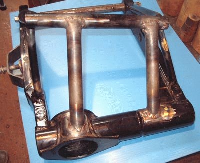 補強もクロモリパイプにて多めにいれ、サスの取り付け部もセットしました。スイングアーム右側のオフセット(約25mm)部も上手く出来ました。