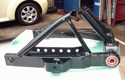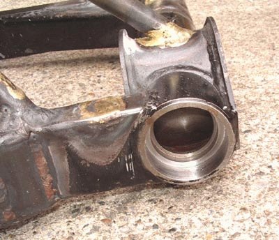 サス取り付け部も補強をバッチリいれました。この一点に応力がかかる為取り付け部周辺から全てやり直しました。溶接はティグ溶接を使い、まずまずきれいに出来たと思います。