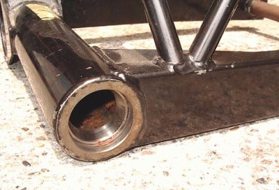 スイングアームの加工に入りました。本来はジグを作るのがスジなのですが、これも大変面倒な為工夫してみました。まず幅を詰める作業ですが、カットして溶接では芯が出ない為パイプ内径の物を丸棒より削り出し、それ自体も軽量化に留意して4mmX80mmほどのパイプ状に仕上げました。外径はスイングアーム内径にほぼ近く叩き込む感じにして芯をだしました。後はティグ溶接してこの部分はOKです。溶棒はステンを使います。スティールにステンを使うのは強度も出るし、仕上がりもキレイに上がるからですね。又ティグを使用したのは引っ張りも弱く狂いが少ない為です。