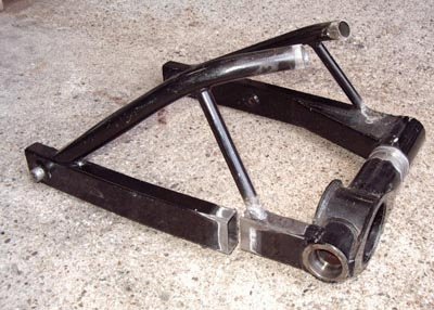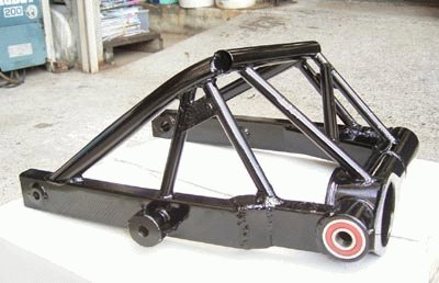 ピボット幅(310mm)を詰めた分右側のスイングアームもオフセットします。これでホイールをセンター近辺に持って行きます。後は補強を入れベアリング穴加工をし、ペイントすれば出来上がりです。又、ベアリング穴加工も左右の芯だしが大変で、この形状では旋盤が使えませんから、NCのフライスで行います(現在加工依頼中)。