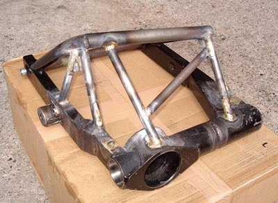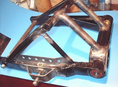 強度的に心配になりまたまた作り変えです。スイングアームスタビライザーはインチサイズのクロモリパイプに交換し、写真の通りサス取り付け部も補強をいれました。重量的には少し重くなりましたが、これで安心してアクセレーターを踏込めます。