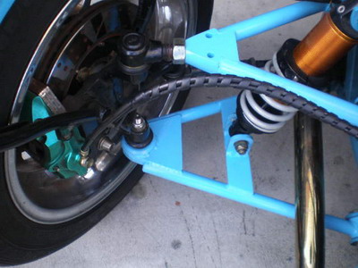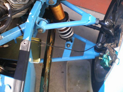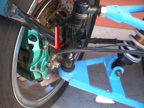 | ワイドトレッド(片側60mm)にした為、ブレーキホースが短くなりました。フルロック時、矢印の様な有様!繰り返しているとホース亀裂、OIL漏れ、ノーブレーキ、大事故につながりかねませんので手当てを施しました。 | ホースも”60mm延長”でフルロックでもこんな感じに・・・これで安心して乗れます。結構、車庫入れ時にハンドルを数回フルに切っている物で・・・危なかった! |