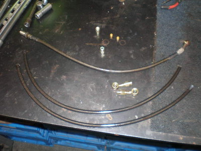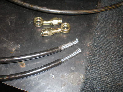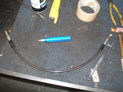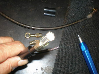| 早速、長さを決める為、ブレーキホースを外します。OILがたらたらこぼれて・・始末が悪いOILなんですよね。ウレタン塗装ですから比較的強いのですが、気をつけないと塗装面が犯され易い。 | 60mm延長してホースを切り出します。ステンメッシュですから、バリが出ます・・ガムテープ等で巻いた上からカットしてしまいます・・・比較的バラケ無い。 |