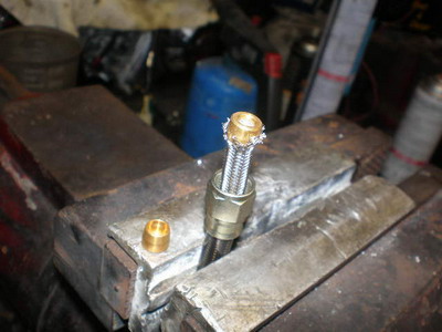 | 特殊工具ってほどでもないけど・・・これは優れ物のツール!切り口のメッシュを広げ、テフロンホースの内側&切り口を一発で整えます。 | 広げたメッシュとホースの間にオリーブを打ち込み、ほぼ完了です。後はフィッティング(バンジョウその他)を差込、ネジ部に専用OILを塗り、締めこんで完成となります。 |