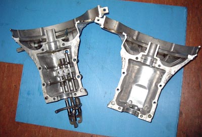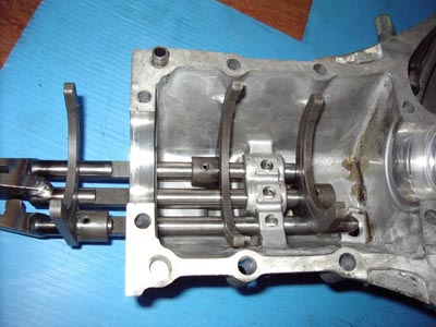 | シフトフォーク組み付けがそこそこ面倒です。5個(直径8mm程)のボールとスプリングと小さなピン1本でギアを動かすフォーク位置を決める訳ですが・・感心する作りです。走行中バックギア飛び込みを防ぐ方法も”なるほど”物です。 組立は順序良く運ばないとボールが入っていきませんし、気をつけないとスプリングで弾き飛ばされ見失います。マニュアルがあれば楽なんですが・・・。 |