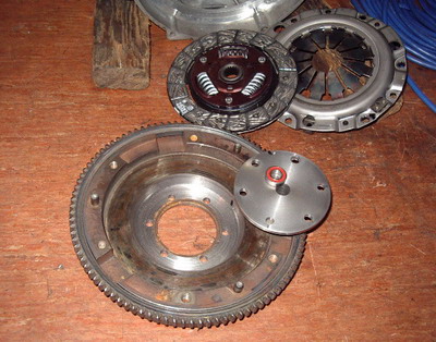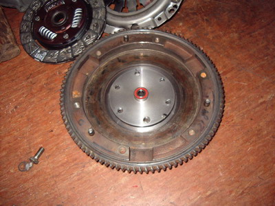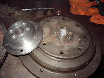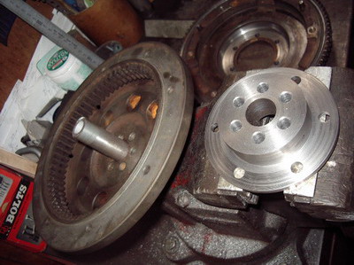 カプチーノ/フライホイールをGuzziエンジンにドッキングさせる為、センター部を削りだしました。前後の位置出しが面倒ですが大まかに削り出し、合わせはボルト(クロモリ)ナットで行います。 エンジンに合わせ取り付け穴を空け、センターもエンジン/クランクに合わせます。クラッチ側にはパイロットベアリングを嵌め込みます・・・もう直ぐ完成! |